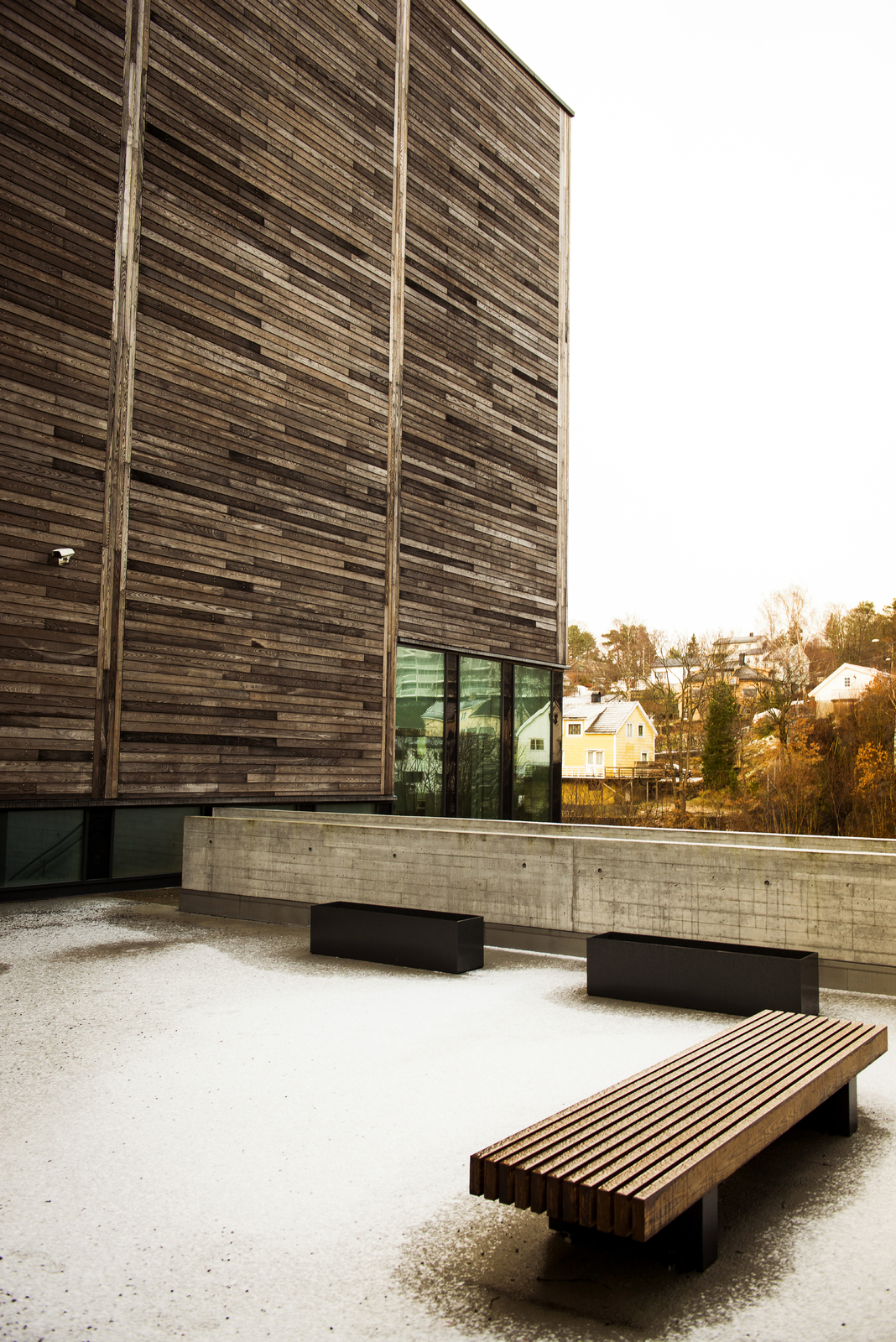 – Det ville blitt en stor utfordring om vi til stadighet måtte male eller olje kledningen. Fargen på termoasken gjør at bygget fremstår som helhetlig i overgangen mellom betong, glass og tre. Vi følger spent med på hvordan fargen endrer seg med tiden – i begynnelsen var den mørk rødbrun, men nå har den blitt lysere, og slik jeg forstår det vil den ende opp i en sølvgrå tone, sier Masdalen, som også har lagt merke til at fargen skifter med vær og vind.