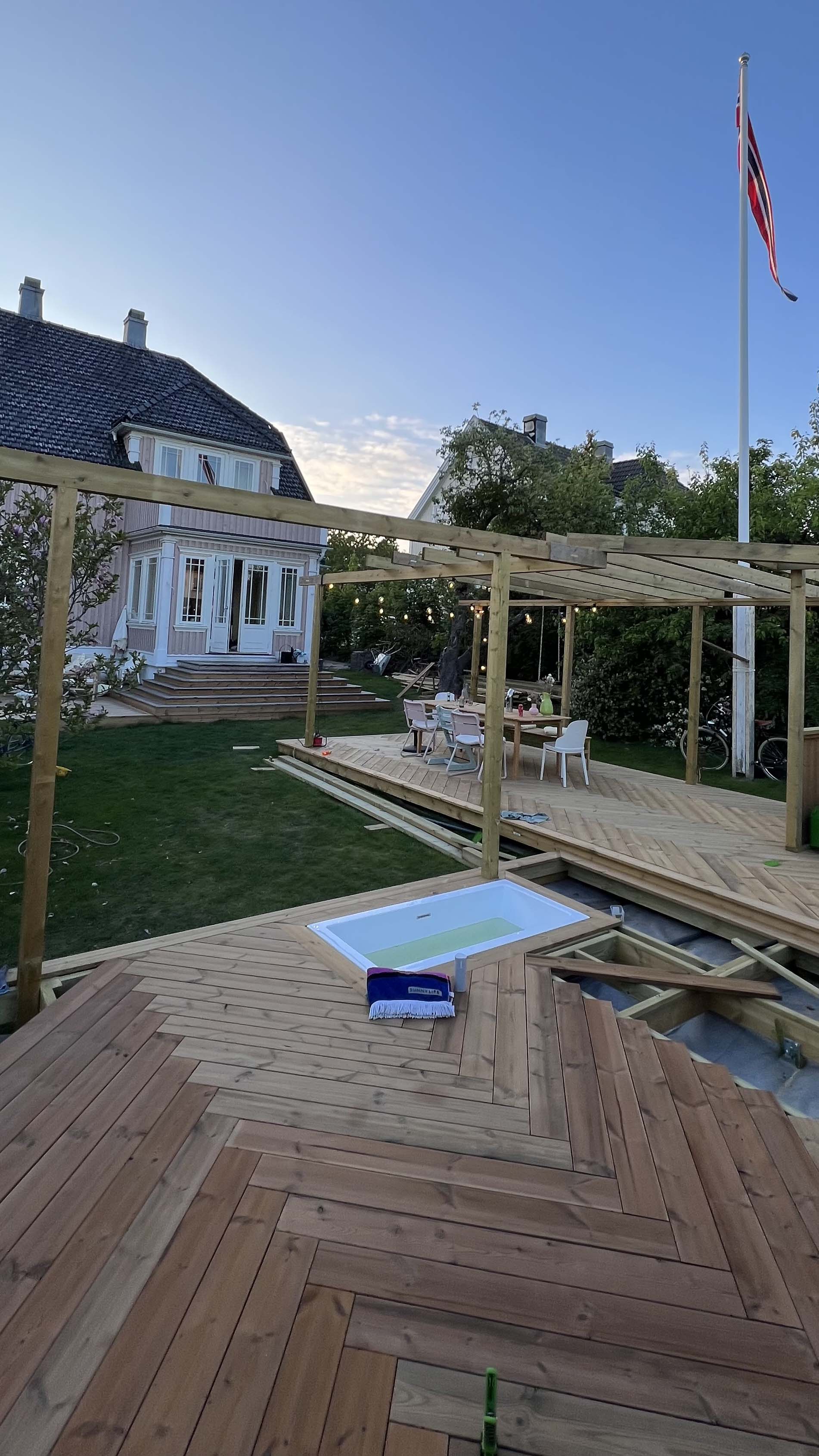 Hele terrassen er lagt i et lekkert fiskebensmønster, dette var mulig da Termofuru er svært formstabilt og nedtørket.