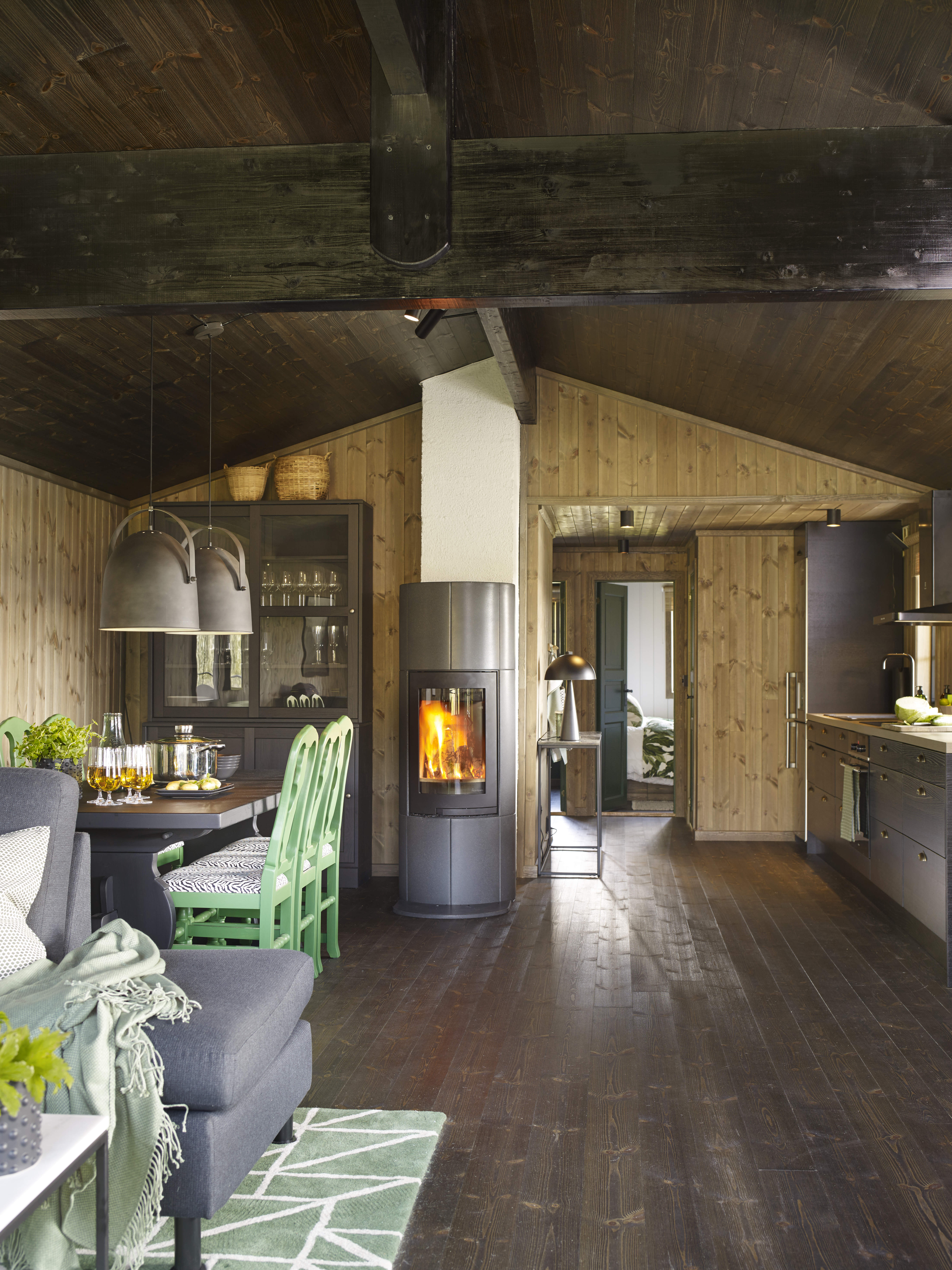 Planen var å beise veggene og sette inn nytt kjøkken, men med stylisthjelp fra Hytteliv, og panel, gulv og lister fra Moelven fikk de nybakte hytteeierene en totalrenovert hytte med personlig stil .