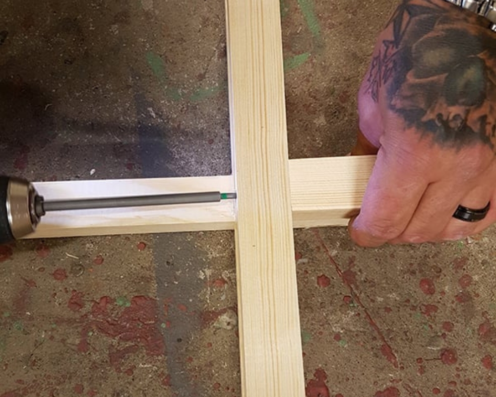 Varje ytterram består av fyra reglar som är 3,5 meter långa och två som är 2,4 meter långa. Börja med att montera ihop dessa till en yttre ram. De kortare reglarna (15 stycken i vårt exempel) fästs mellan de längre. När du är klar med den första ramen bygger du den andra direkt ovanpå så att de blir exakt lika.