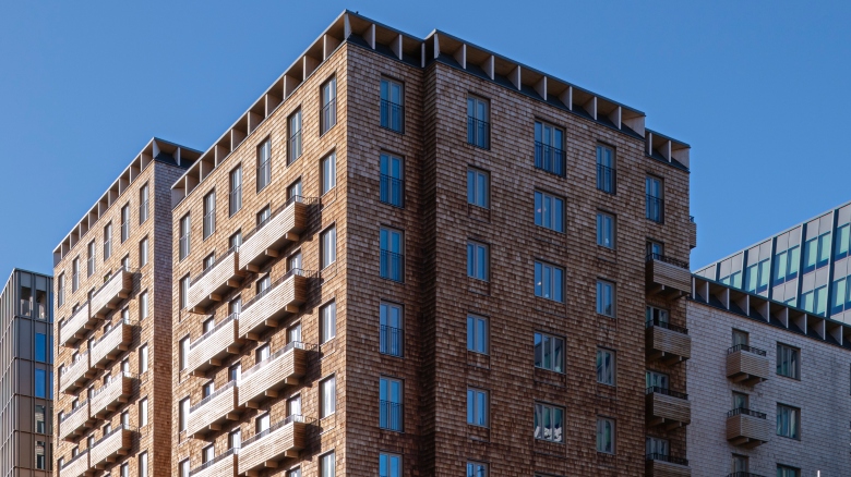 Valet av cederspån blev ett självklart val då det är en underhållsfri fasad som även är brandtestad, samt rimmar väl med tanken om en stenstadsarkitektur eftersom det på håll kan liknas vid tegel