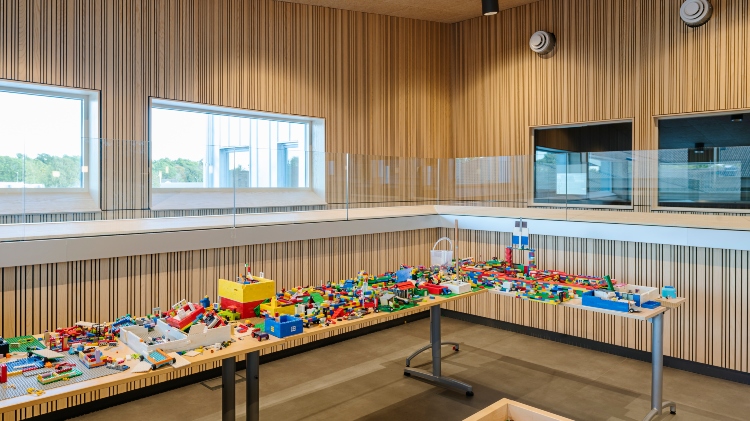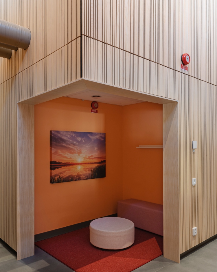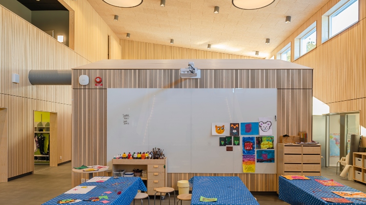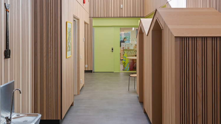 Moelven Studio Stripe Ask i utförandet Random design smyckar väggarna i den nya skolan JKC i Jämjö. Ribborna har varierande bredd och ger rummen ett lekfullt uttryck och bidrar till bra akustik. Även Moelven Studiopanel Ask med sina släta skivor pryder utvalda delar för att fullända det visuella.