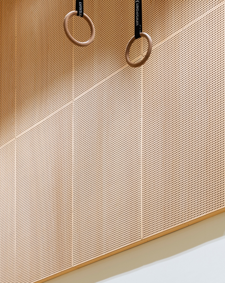 I Parkdalaskolans idrottshall har man valt att använda sig av två olika perforeringar på Moelven Studiopanel Ask. De perforeringar som använts i projektet är Ø8 CC20 (öppningsgrad 12%) samt Ø12 CC20 (öppningsgrad 29%).