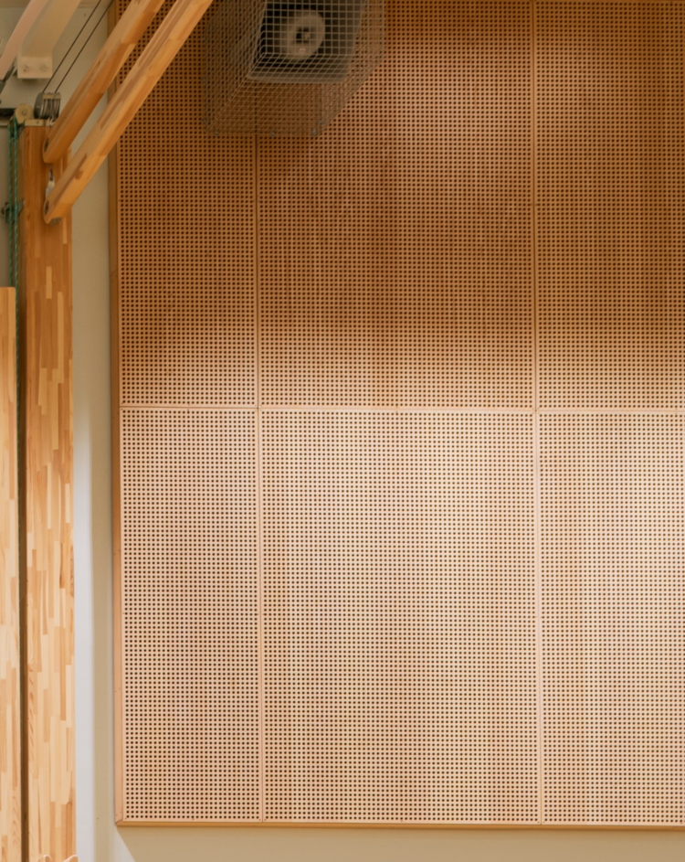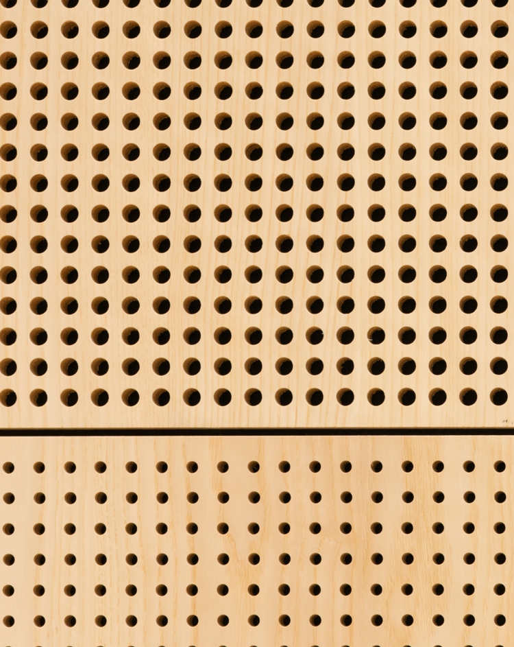 I projektet valde man att montera Moelven Studiopanel i olika sektioner med en ram runt vilket ger intrycket av tavlor som sitter på väggen. Bakom de perforerade skivorna sitter en svart akustikduk, vilket skapar en unik estetisk lösning ihop med förbättrad akustik.
