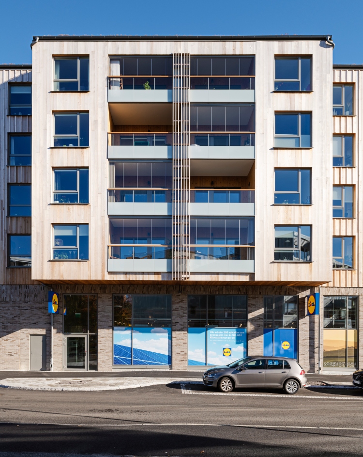 Tre olika profiler har använts i fasaden, profil 471 som är en slät panel, profil 501 som är en spårpanel samt profil 581 som är en spårpanel med ett extra spår. För att skapa ett varierande uttryck har ribbor monterats i olika sektioner. Kombinationen av olika profiler och dimensioner skapar en lugn men samtidigt livfull fasad.