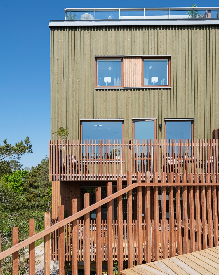 Fasaderna är bruna och gröna för att smälta in fint i naturen och bland trädkronorna. Samtidigt som träfasaderna signalerar samhörighet med Trosas traditionella trähusbebyggelse, har de en mer organisk design som ger en modern och nutida tolkning, säger Jacob Haas, ansvarig arkitekt.
