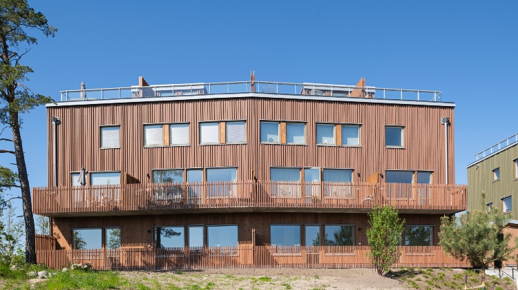På Brf Sjöutsikten i Trosa är fasaderna klädda med brandimpregnerad och pigmenterad ThermoWood. BT Pigment i kulörerna i Grönt, Svagt brun och Varmbrun skapar kontraster och smälter samtidigt in i omgivningen. De olika profilerna och vertikala ribbor i blandade dimensioner ger fasaden extra karaktär.