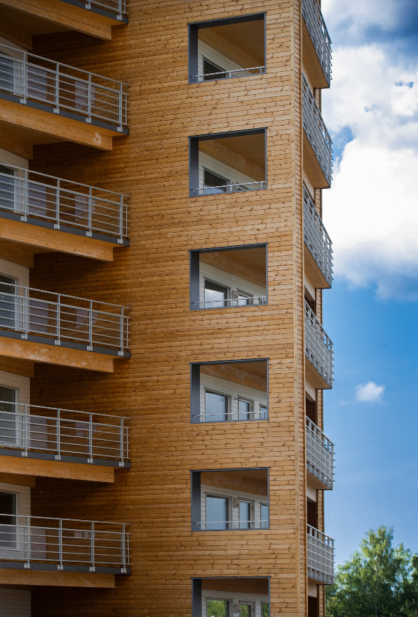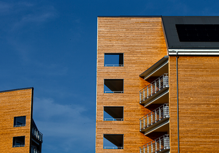 ThermoWood har blivit populärt att använda som fasadmaterial på flerbostadshus. Anledningen tror vi på Moelven är vår kärlek till furu, det naturliga utseendet och den höga kvalitén till ett bra pris. Att det också uppfyller rätt brandklass och att det är godkänt enligt bruksklass som påvisar att brandskyddet håller över tid är självklart också viktiga parametrar!