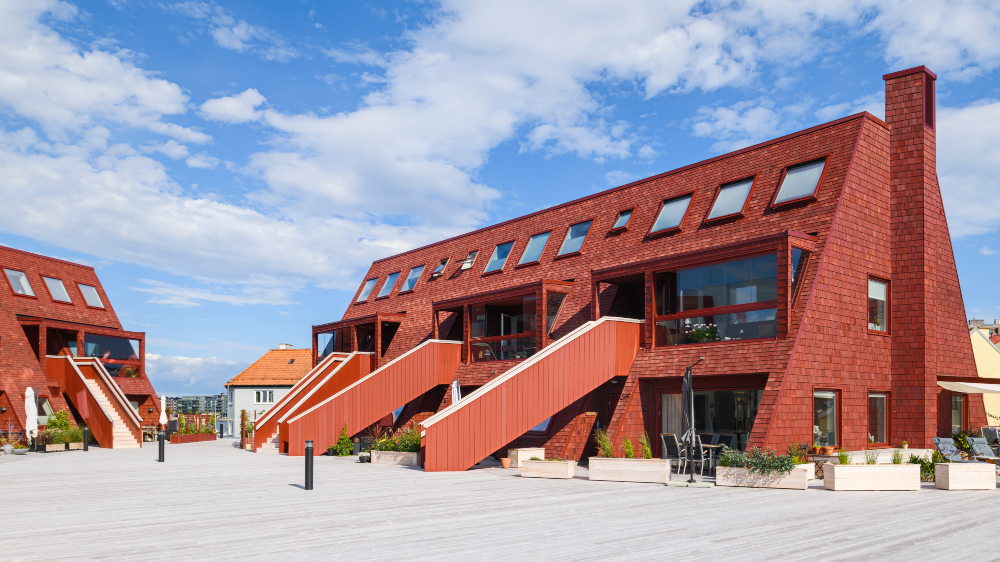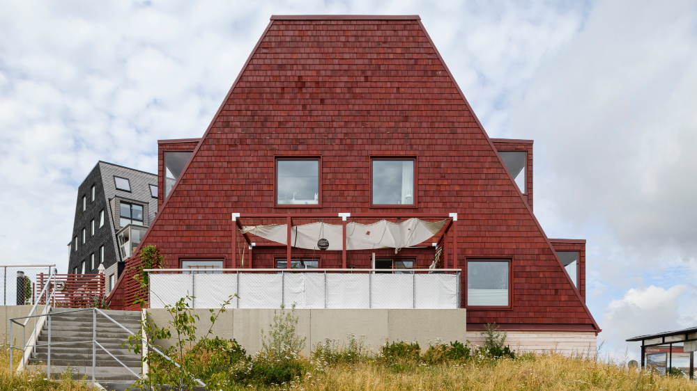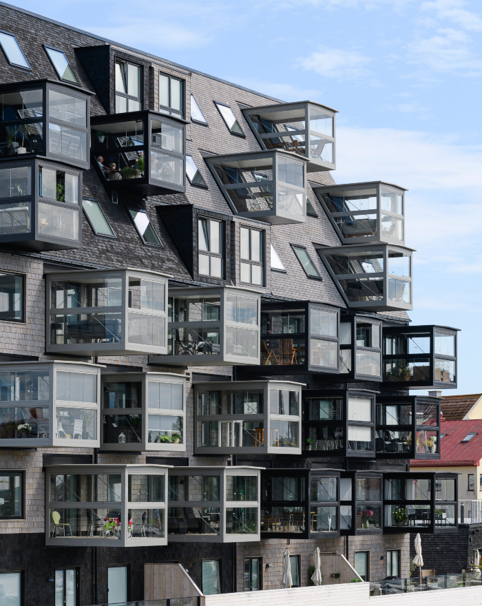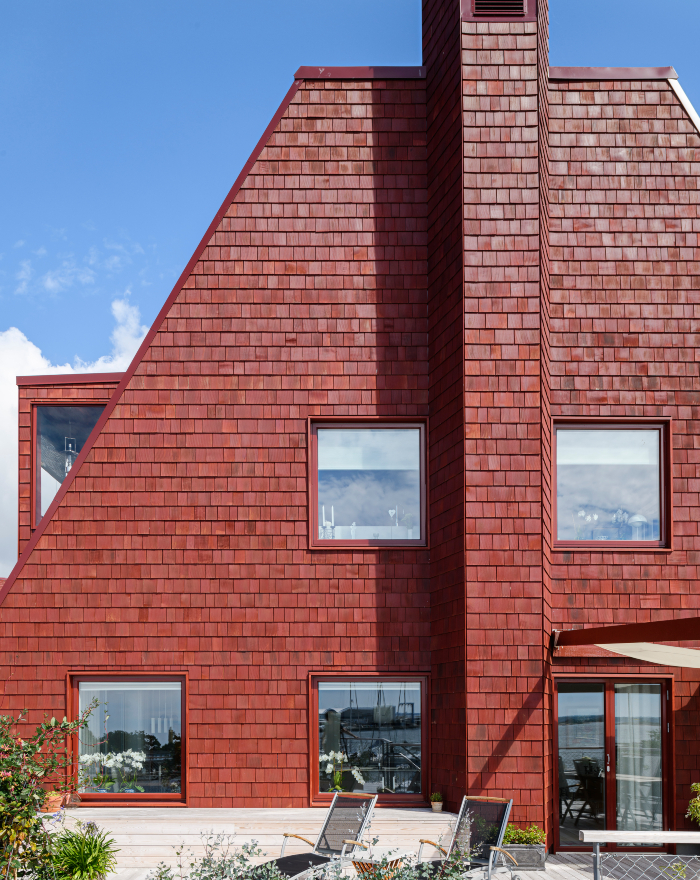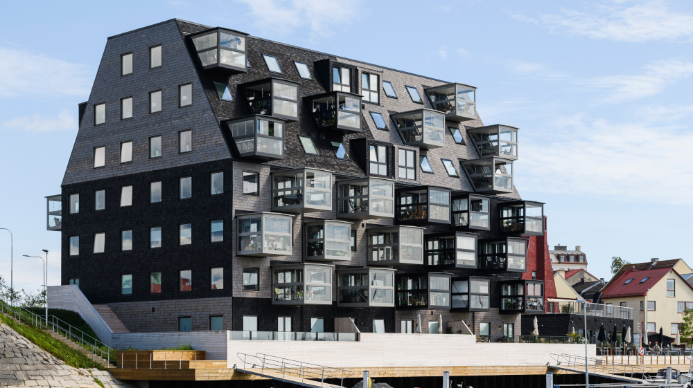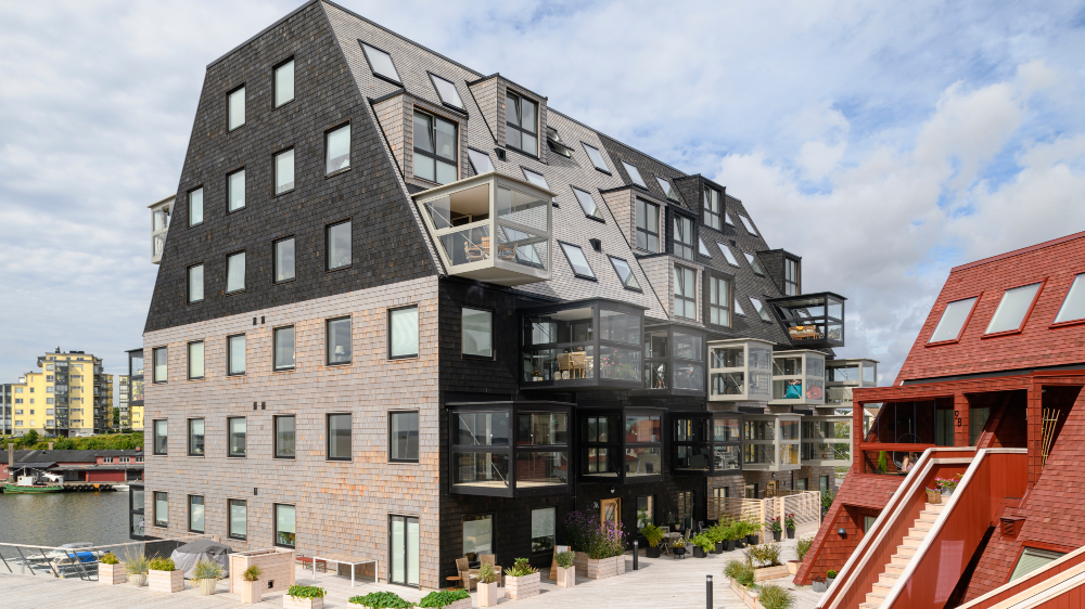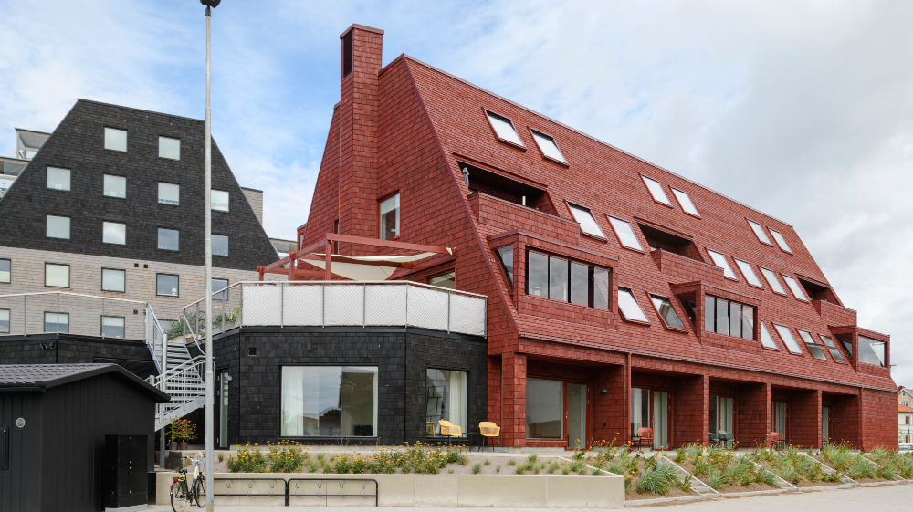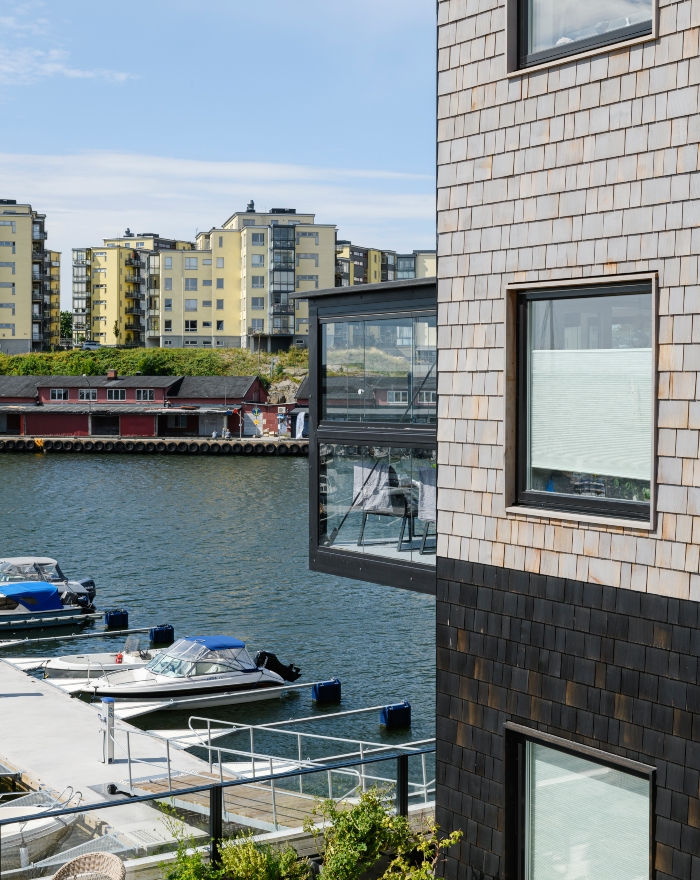 Unikt trähusprojekt längs kajkanten i Karlskrona, eller som Svenskt Trä skriver "En ny silhuett i världsarvet Karlskrona". Två huskroppar med brandskyddad röd cederträspån och en huskropp med brandskyddad cederträspån i kulör svart och silver. Cederträspån-panelen är testad och godkänd enligt SP Fire 105 med bakomliggande brandskyddad plywood som är lokalt producerad av Moelven Vänerply.