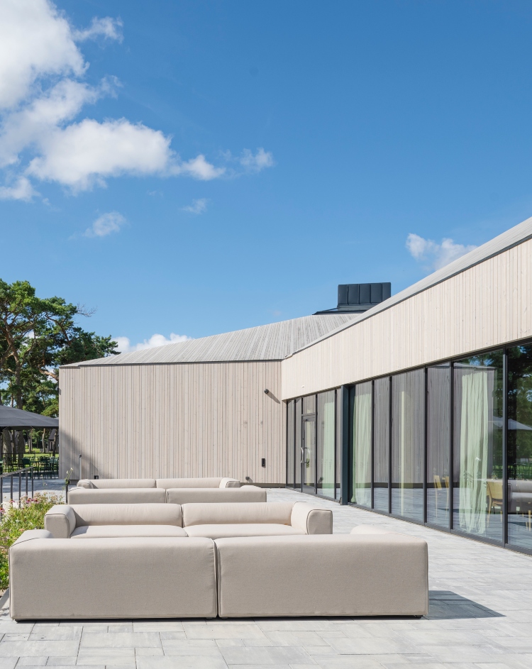Här möter sanddynerna den vackra tallskogen och den nya byggnadens design tar tydligt avstamp i den unika platsen. Byggnaden signalerar öppenhet och rymd och skapar utblick i alla riktningar mot golfbanan och dess terrasser där eldstäder möjliggör uteliv året om. En av utmaningarna i projektet var att byggnaden inte har någon baksida, utifrån den utgångspunkten har tre lika volymer skapats och pusslats samman, roterade efter väderstreck för att optimera ljusspelet kring volymerna som bildas och låta helheten spegla pinade sanddynor säger Jerker Edfast, Ansvarig arkitekt för byggnaden. Både exteriören och interiören speglas av naturmaterial och dess naturliga elegans tillsammans med hög detaljering och fingertoppskänsla kring att skapa en unik miljö med känslan av att känna in platsen och dess naturliga egenskaper. De ståtliga eldstäderna skapar rumslighet i de höga volymerna där man gärna lyfter blicken mot fantastiska takljus som öppnar sig mot himmeln. Huvudnumret får nog ändå tilldelas kombinationen av allt fantastiskt trä tillsammans med baren gjord i lokal svart diabas säger Olivia Johansson, Ansvarig arkitekt för konceptet kring materialval och interiören.