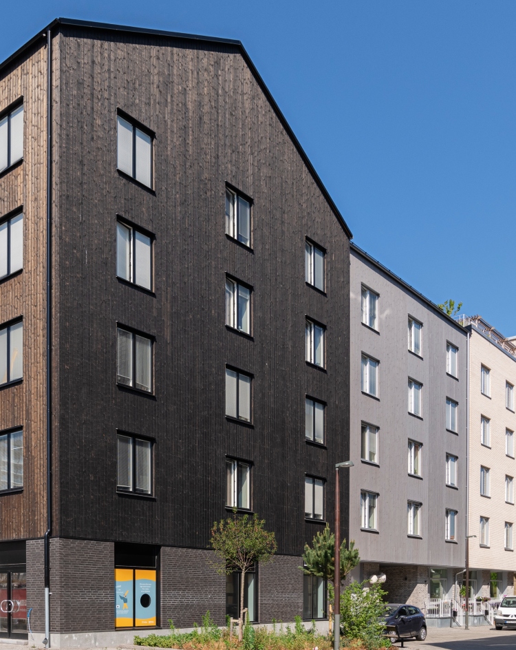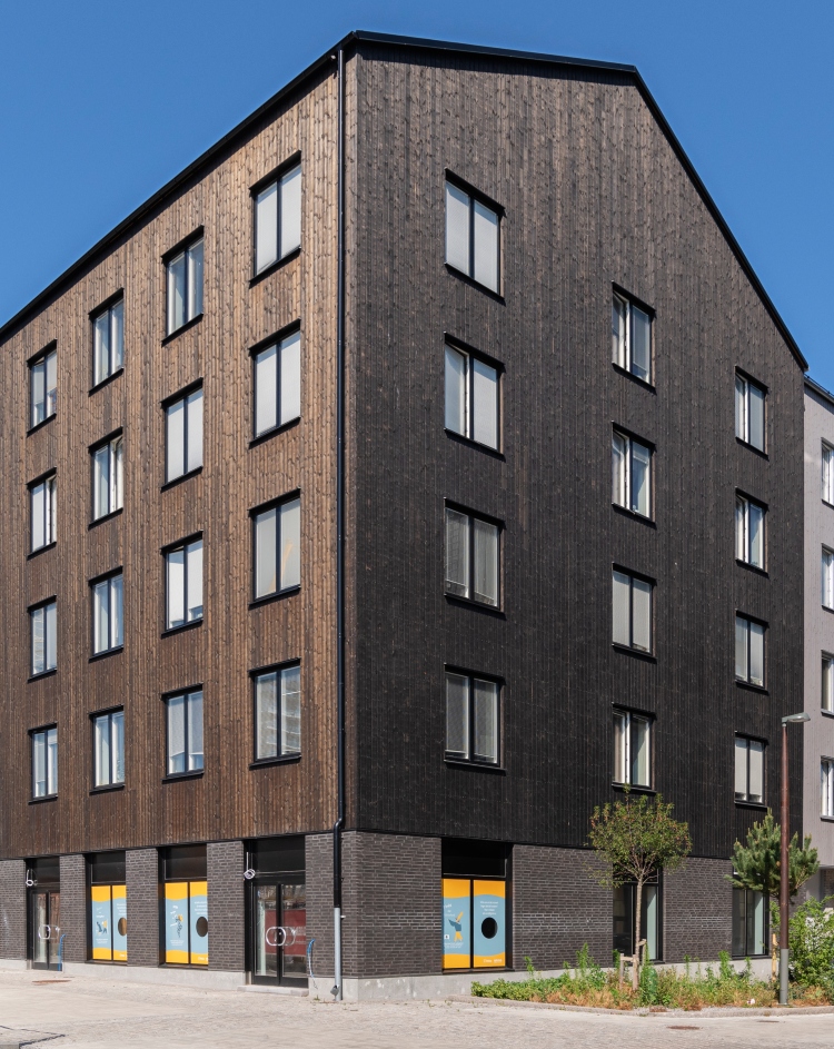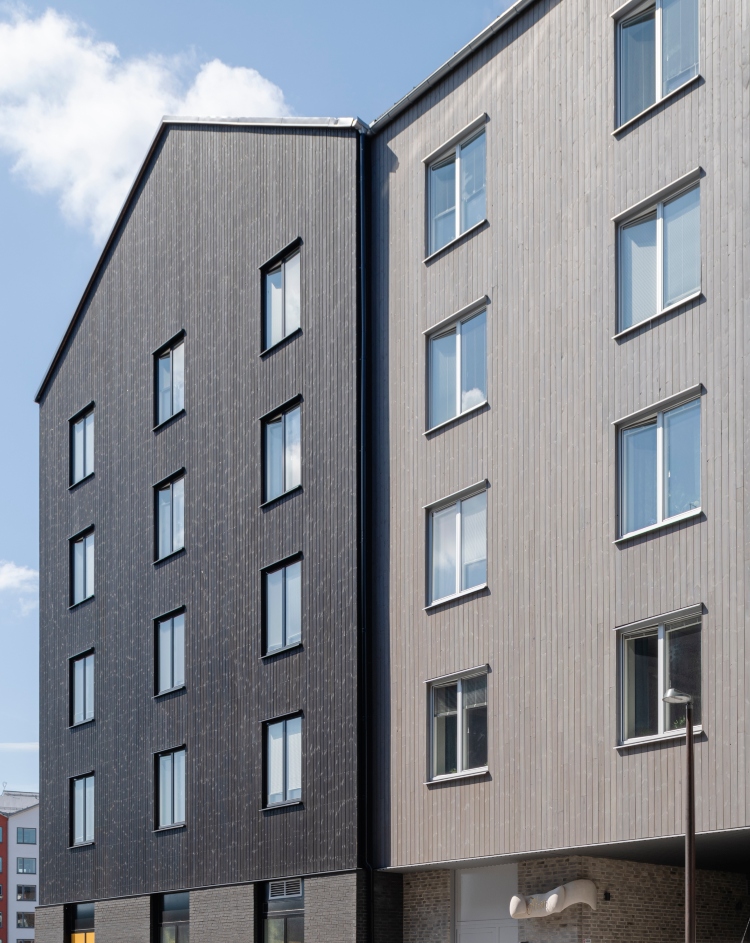 I det nya området Norrtälje hamn ligger Kv Alen. Fasaderna smyckas av både naturlig och pigmenterad ThermoWood i standardkulörerna Svart och Patinagrå. Panelen är dessutom brandskyddad enligt SP Fire 105.