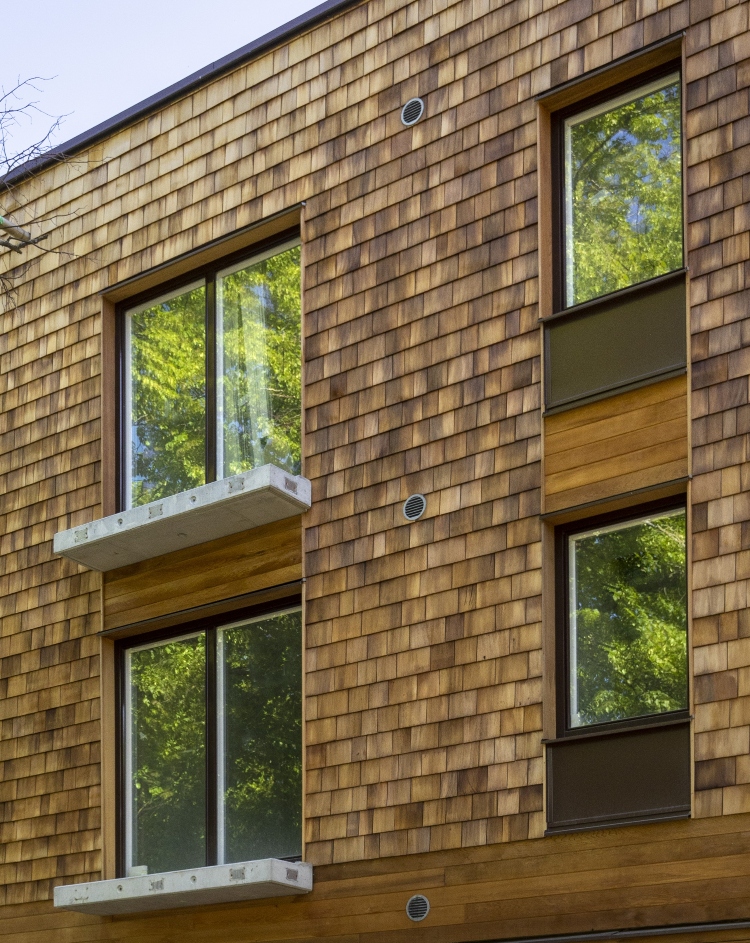 Cederträspån skapar med sina naturliga färgvariationer och olika bredder en extra livfull fasad. Spånen varierar naturligt i färgerna brunt, gult och rött och levereras i blandade bredder mellan 70-300 mm. Den liggande panelen under fönstren skapar en lugn kontrast till spånen.