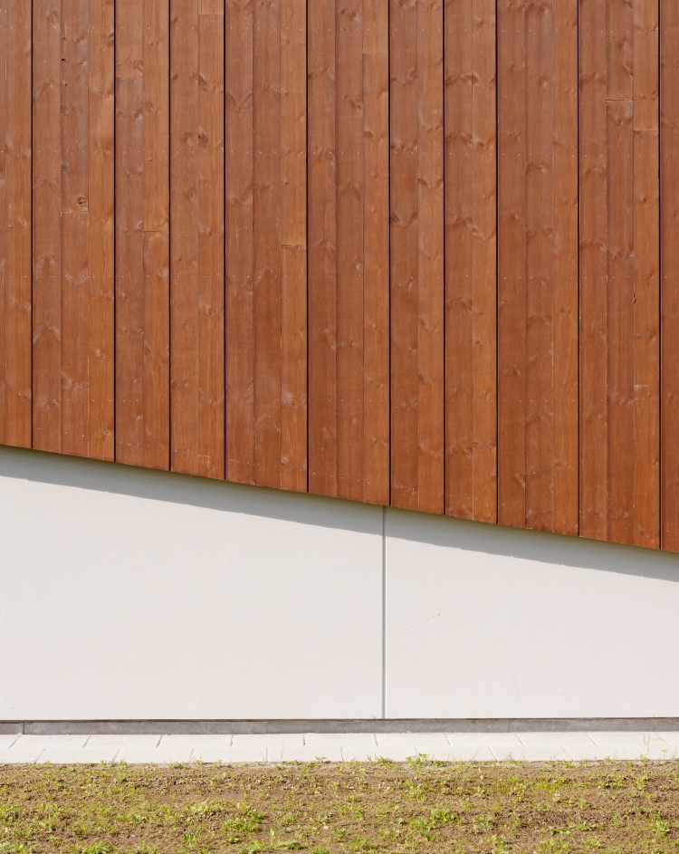 För att även vara intressant på nära håll har vi arbetat noggrant med detaljeringen av träfasaden. Ett varierat antal brädor har satts ihop utan distans, med en profilering som möter nästa enhet panelbrädor. Detta skapar ett intryck av breda brädor och ger hela fasaden ett intressant uttryck och detaljrikedom.