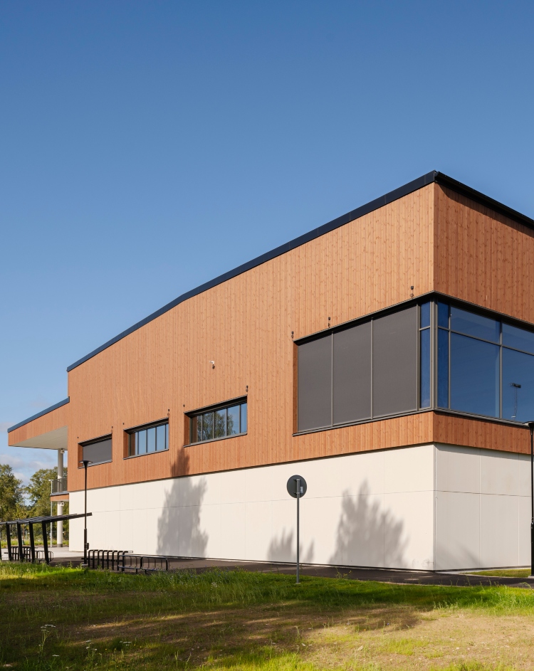 För att uppnå detta har vi använt stora grepp i gestaltningen, där träfasaden avslutas med en varierad och kontinuerlig linje i förhållande till den underliggande betongfasaden, vilket gör att byggnaden får karaktär på långt håll.