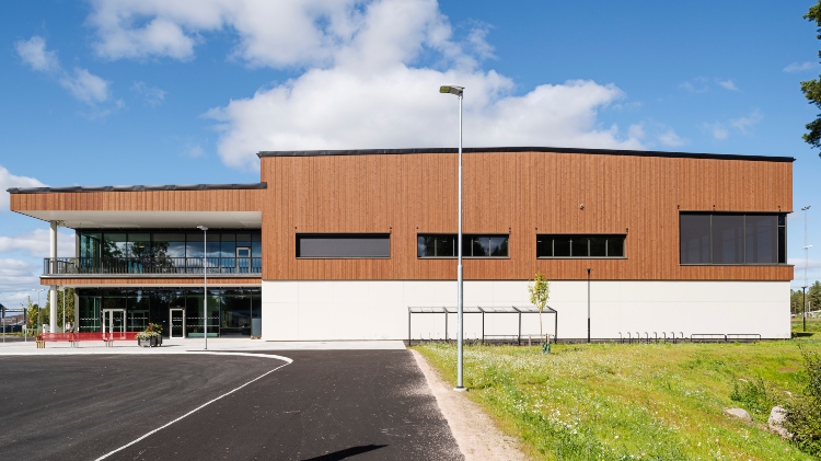 Med ThermoWood BT Pigment i kulörerna Mahogny brun och Vit har Malung Simhall ett naturligt varmt uttryck. Genom att kombinera ThermoWood i två olika profiler har arkitekten skapat känslan av en extra bred panel som samtidigt är intressant på nära håll. Fasaderna är brandskyddade enligt SP FIRE 105 med bruksklass EN16755.
