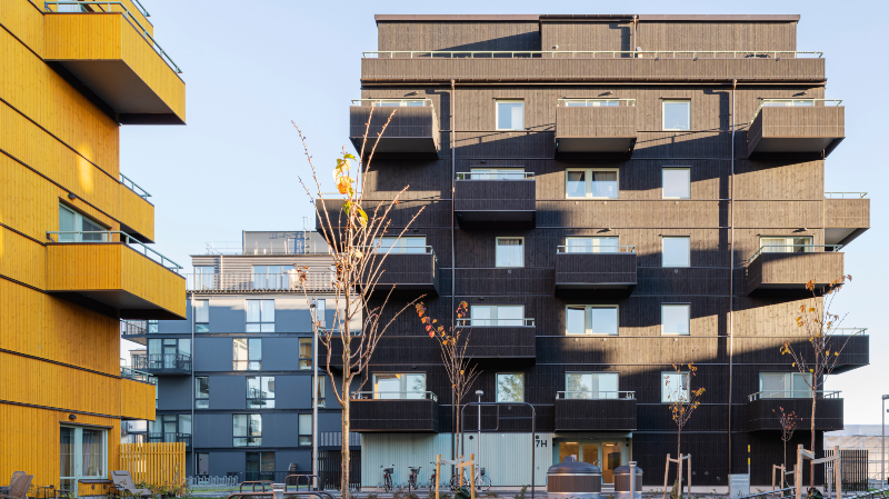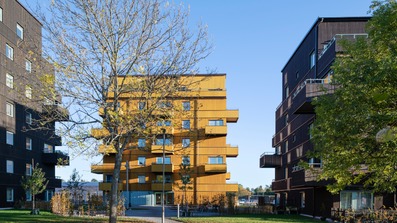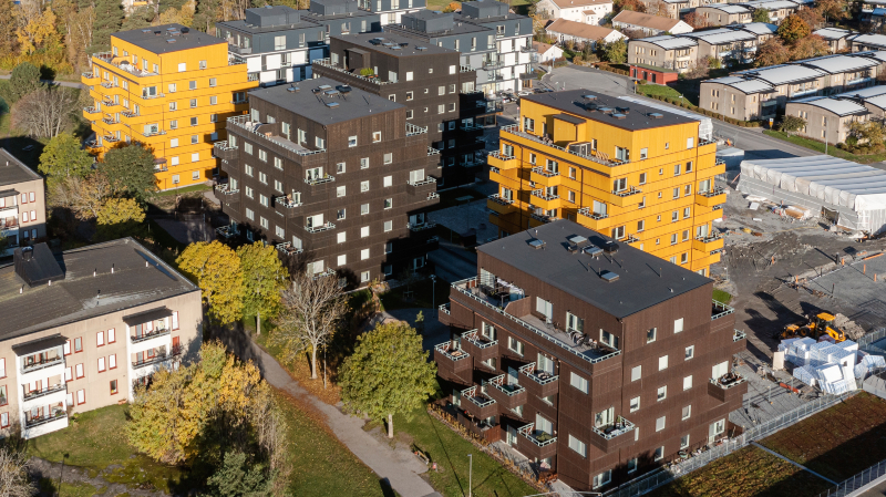 Brandklassad värmebehandlad furu i tre olika kulörer - gul, brun och svart. Husen varierar mellan 4 och 7 våningar och samtliga byggnader är brandklassade enligt SP Fire 105. Nacka kommun har prisat projektet och Aros Bostadsutveckling för hållbar stadsutveckling.