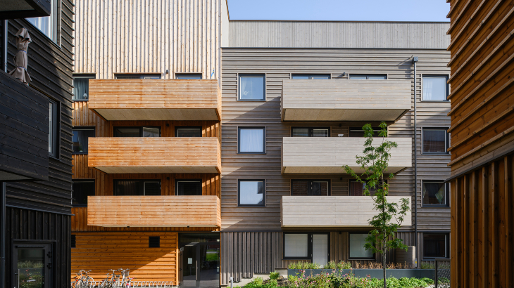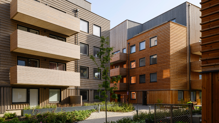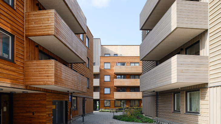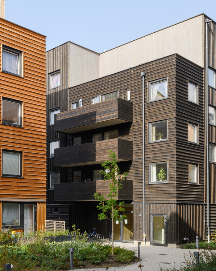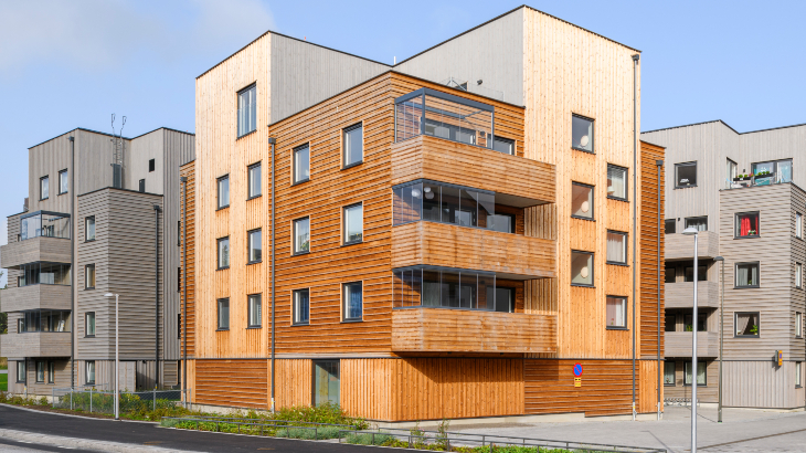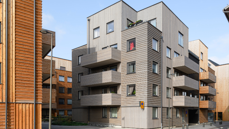 SigtunaStadsängars ambition är att bygga Sveriges mest hållbara stadsdel. Stadsdelen består bland annat av miljöcertifierade hyresrätter med trivsamma gemensamma ytor. Till projektet har vi levererat brandsäker fasadpanel i form av ThermoWood som är brandskyddad enligt SP Fire 105. Panelen levererades både med och utan BT infärgning.