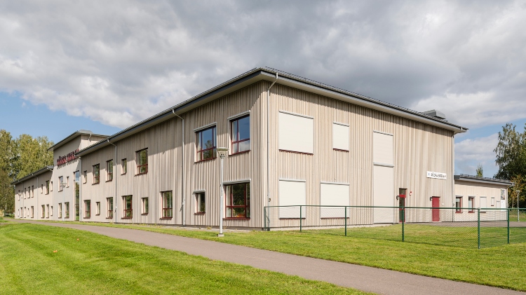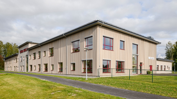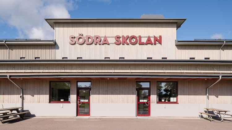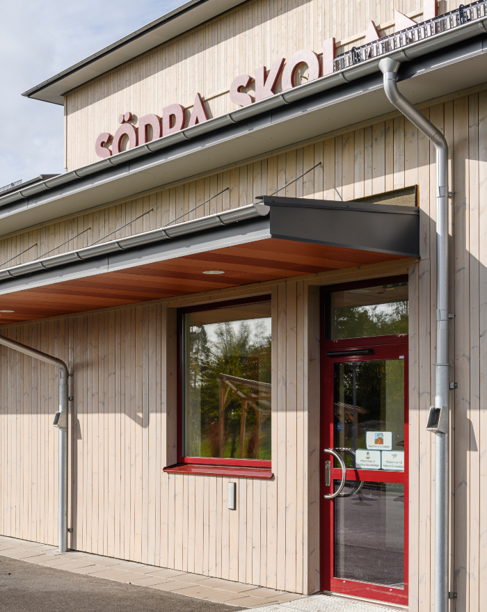 Södra skolan i Grums är beklädd med en ytterpanel från Moelven. Den vämebehandlade furupanelen (ThermoWood) är också industriellt behandlad med patineringsolja. Oljan tillför ett extra skydd och fasaden kommer att åldras naturligt med värdighet.