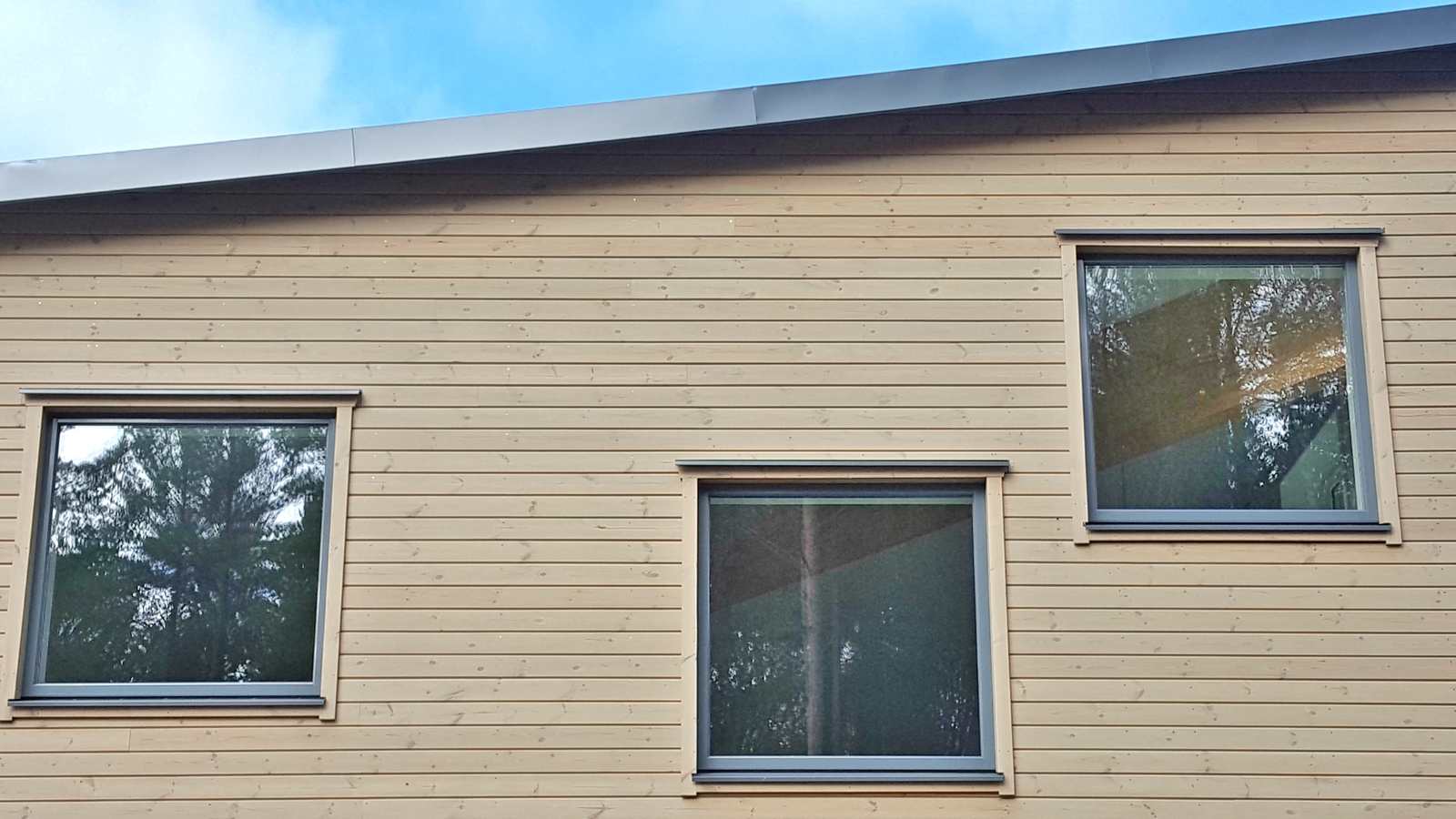 Arkitekten valde dubbelfasprofilen 431 till fasaderna och nyttjade profilen för liggande montage. Panelens skarvning är fallande längs fasaden vilket är ett smart sätt för att minimera andel spill och/eller längdhantering på plats. Ytskiktet på panelen är hyvlat som ger ett rent och elegant utseende.