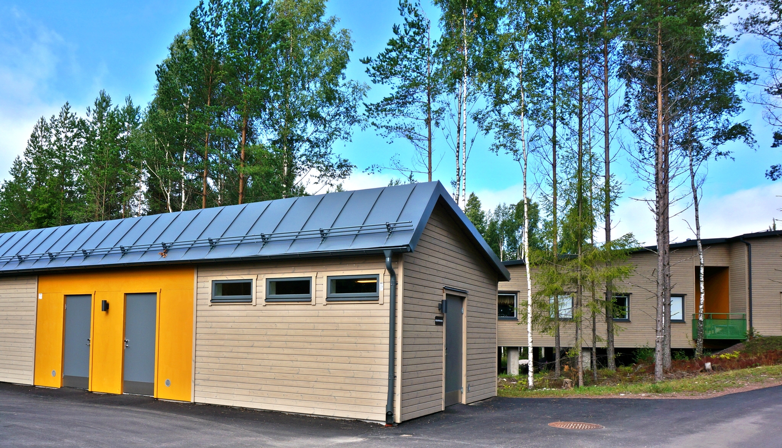 Ett gruppboende i naturligt läge som utstrålar lugn och harmoni. Två huskroppar, en komplementbyggnad och vindskydd är beklädda med ThermoWood som är fabriksbehandlat med Olja Premium 903 som ger ett grånat utseende.