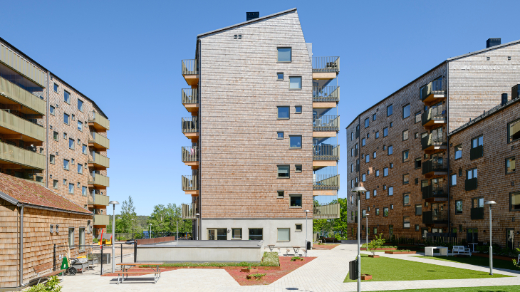 I skrivande stund är Trummens Strand i Växjö det största träprojektet i Sverige, och ett av de största träprojekten i Europa. Du hittar projektet söder om stadskärnan med utsikt över sjön Trummen. Huskropparna är byggda med massivträ och täckta med cederträspån från Moelven. Cederträspån är ett exklusivt men också prisvärt val som fasadmaterial till flerbostadshus.