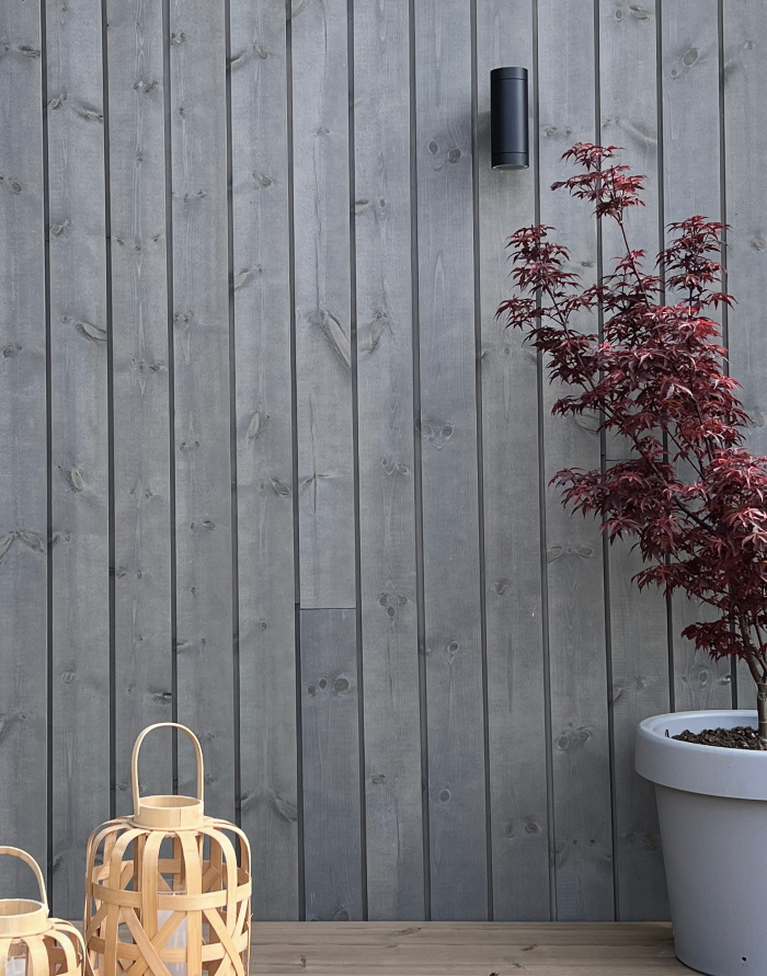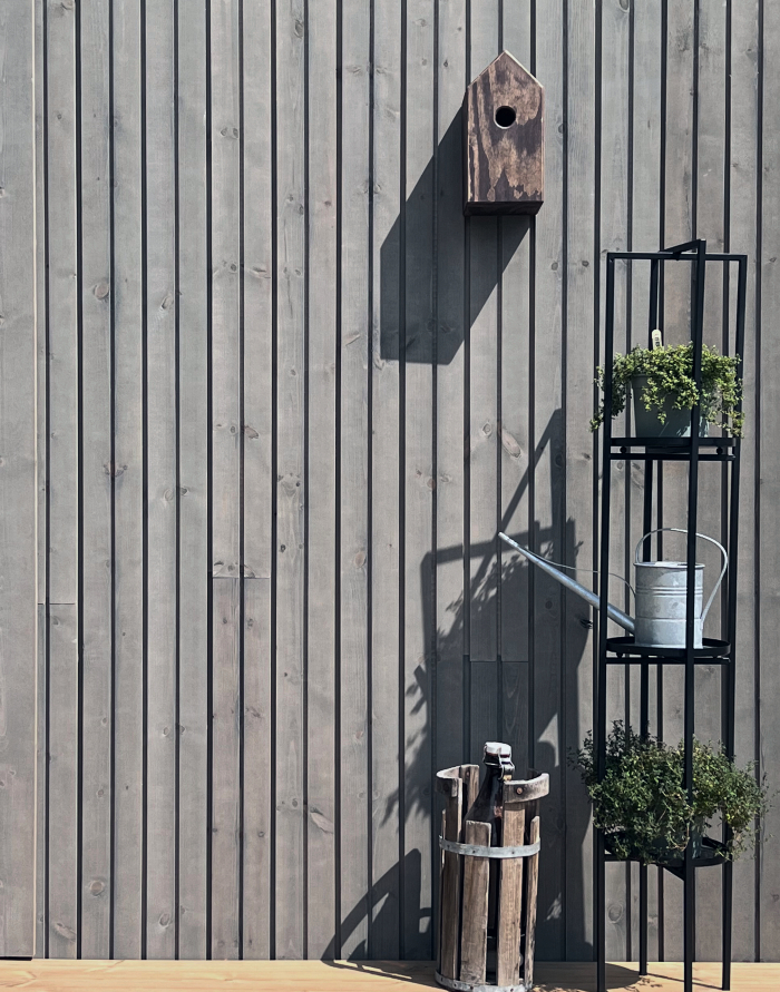 Vi erbjuder Kärnfuru-panel med en industriell ytbehandling i kulör patinagrå eller silver. Det ger panelen bra förutsättning för att åldras snyggt över tid samtidigt som du får ett åldrat utseende redan från start.