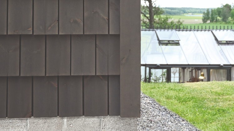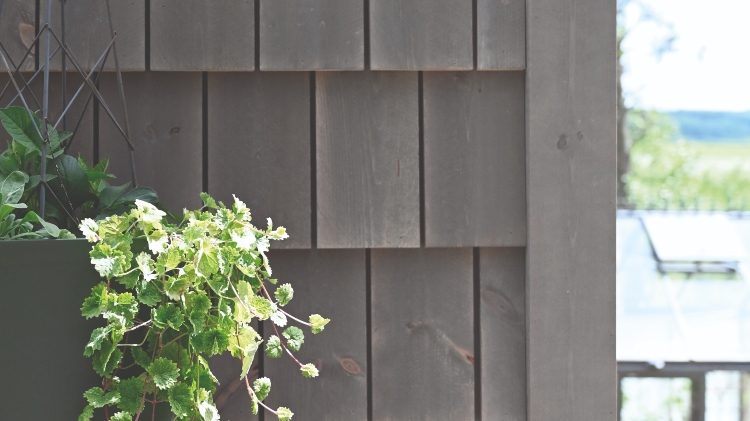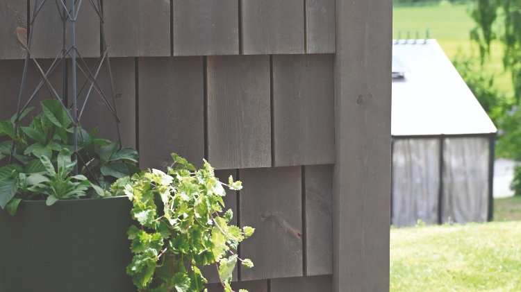 Kärnfuruspån levereras med en industriell ytbehandling i kulör patinagrå för att minska risken för ytmögel. Ytbehandlingen kommer med tiden möta träets naturliga grånad och behöver vid behov rengöras.